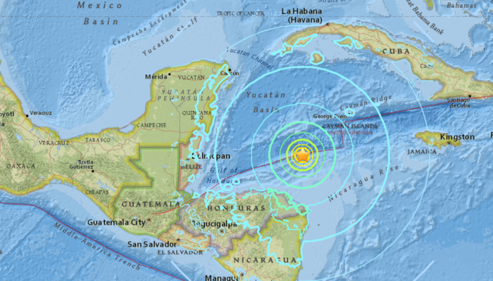 O tremor, que teve 10 quilômetros de profundidade, aconteceu no mar, entre a ilha de Cuba e as costas de Honduras e Belize, segundo mostram os mapas do USGS.