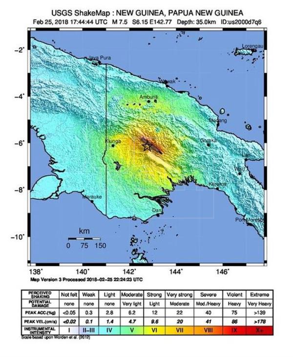 O terremoto de 7,5 graus de magnitude foi registrado a uma profundidade de 35 quilômetros e com epicentro a cerca de 90 quilômetros ao sul de Porgera, na província de Enga, segundo o Serviço Geológico dos Estados Unidos (USGS, sigla em inglês).