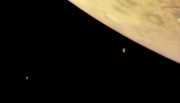 Na mesma imagem podem ainda ser vistas duas das luas do planeta, Io e Europa.